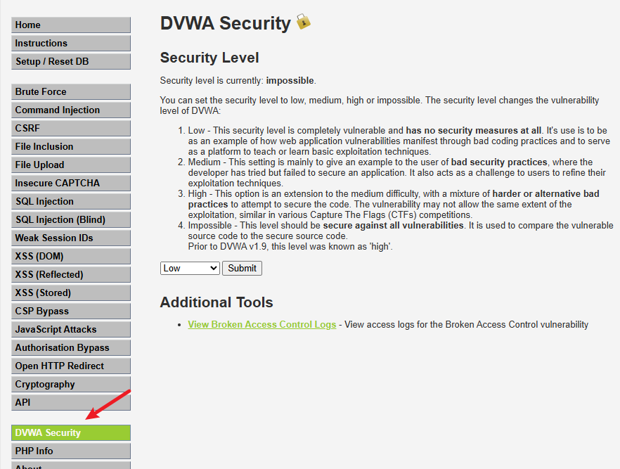 登录后点左侧DVWA Security,把安全级别改成Low然后点Submit